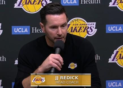 赛后,湖人队主帅JJ-雷迪克出席了发布会,他对于球队目前的表现并不满意,并指出了在场上与球员交流时出现的问题。雷迪克说道:“我不知道你们看不看棒球,但你们都知道三垒手打手势的技巧,我们一直在练习,这样就不会重蹈覆辙,像在客战76人和太阳的比赛时,我指挥战术的时候,队员们却不知道该怎么做。”